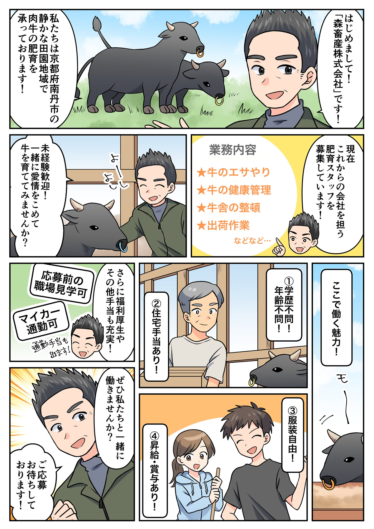 | 仕事内容 | 肉牛の肥育作業で以下の業務を担当していただきます。 (約350頭を飼育しています) *牛のエサやり ・エサの準備(飼槽の掃除後にエサやり) ・飼槽の掃除(飼槽:エサをやるための容器) ●牛の健康管理 ・牛の状態の管理、記録 ●牛舎の整頓 ・床に敷きつめているおがくずの交換 ・除糞作業 ●出荷作業(週1回)など。 |